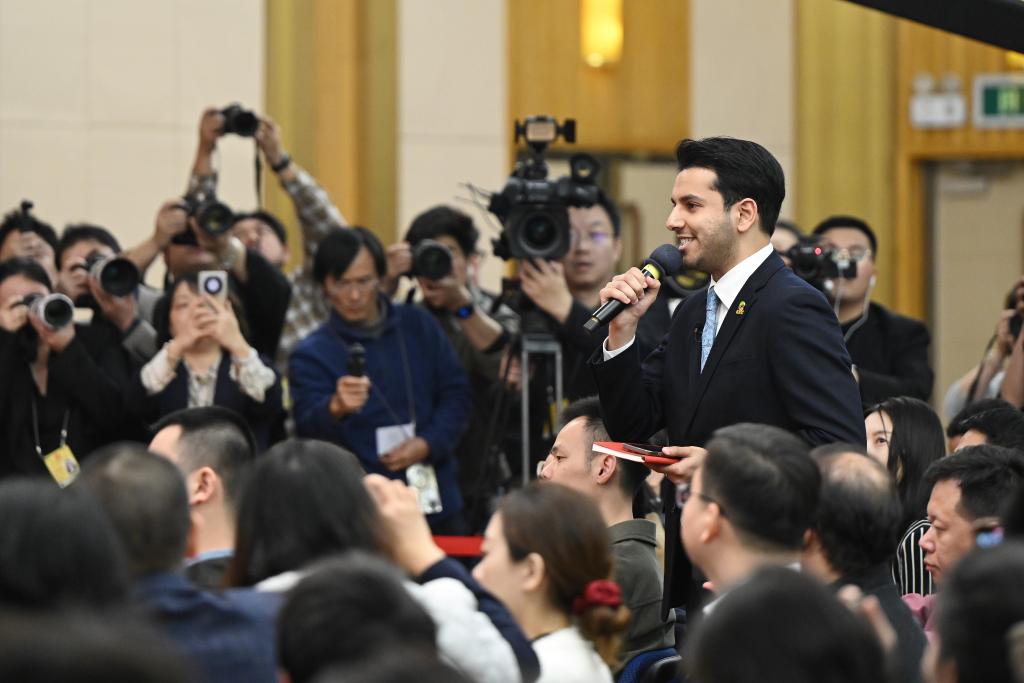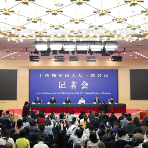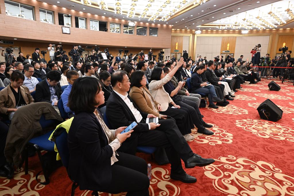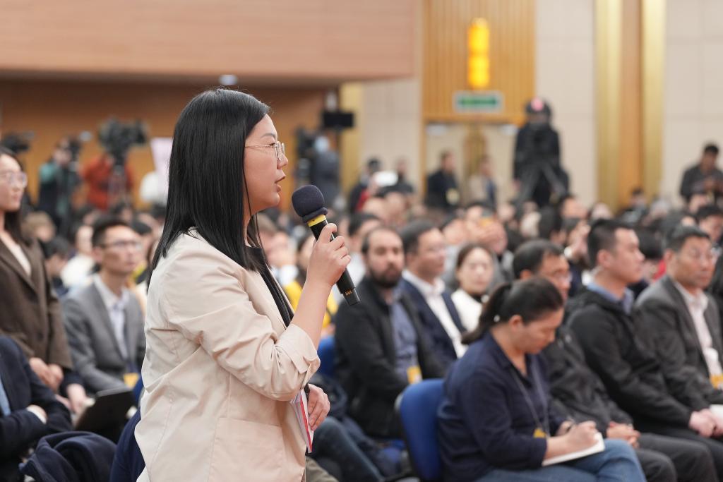 3月9日,十四届全国人大三次会议在北京梅地亚中心新闻发布厅举行记者会。民政部部长陆治原、人力资源和社会保障部部长王晓萍、住房和城乡建设部部长倪虹、国家卫生健康委员会主任雷海潮就民政、就业和社会保障、住房、卫生健康等相关问题回答中外记者提问。这是记者在提问。