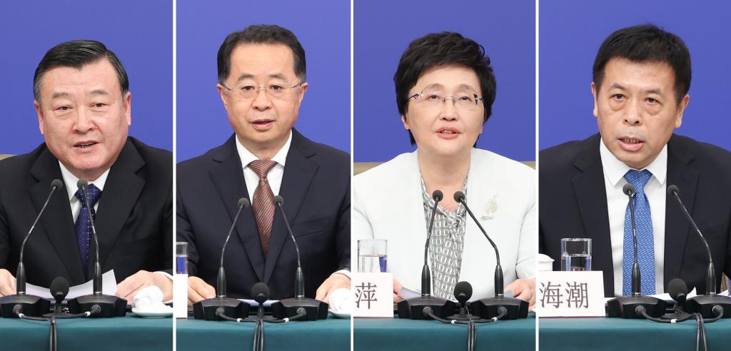 3月9日,十四届全国人大三次会议在北京梅地亚中心新闻发布厅举行记者会。民政部部长陆治原(左二)、人力资源和社会保障部部长王晓萍(右二)、住房和城乡建设部部长倪虹(左一)、国家卫生健康委员会主任雷海潮(右一)就民政、就业和社会保障、住房、卫生健康等相关问题回答中外记者提问(拼版照片)。