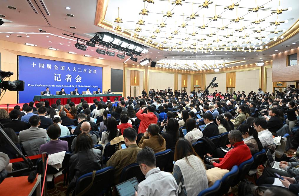3月9日,十四届全国人大三次会议在北京梅地亚中心新闻发布厅举行记者会。民政部部长陆治原、人力资源和社会保障部部长王晓萍、住房和城乡建设部部长倪虹、国家卫生健康委员会主任雷海潮就民政、就业和社会保障、住房、卫生健康等相关问题回答中外记者提问。这是记者在现场采访拍摄。