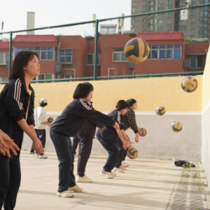 4月8日,西安辅轮中学学生在阳光体育大课间30分钟练习排球。