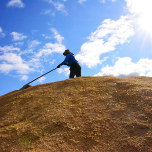 10月8日,在北大荒集团黑龙江绥滨农场有限公司东井管理区粮食晒场,工人对收获的水稻进行集中堆放。