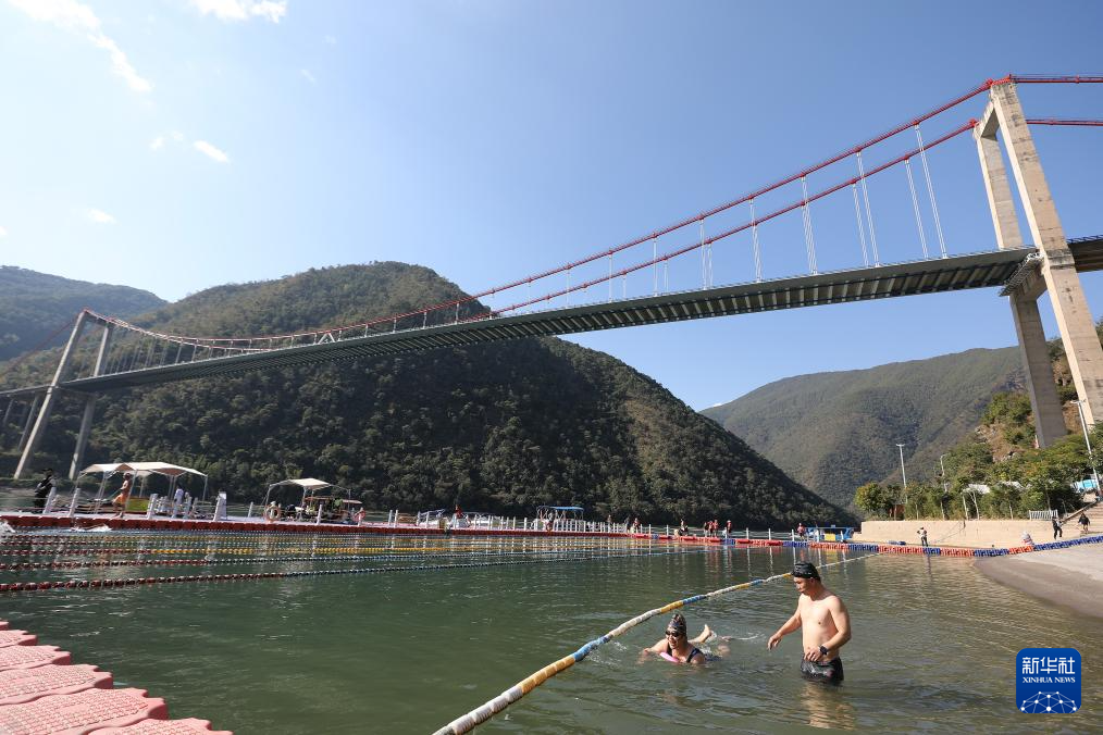 冬日,云南省大理白族自治州南涧彝族自治县公郎镇的澜沧江猛龙渡依旧热闹,游客在碧水青山间游泳、划桨板、骑摩托艇,享受“玩水”乐趣。