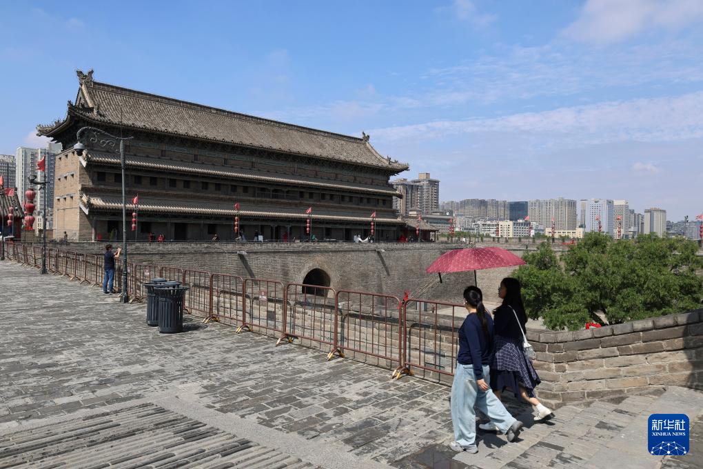 游客在西安城墙永宁门内游览,左侧城墙上布设着城墙病害数据传感监测设备(2025年9月12日摄)。