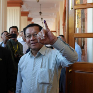 这是2025年12月28日,敏昂莱在缅甸内比都的一处投票站参加缅甸大选投票后展示蘸有墨水的手指。