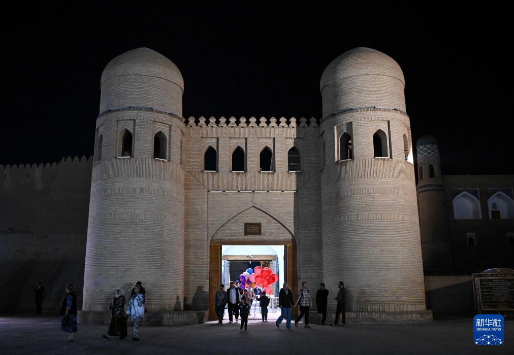 4月26日晚,人们走出乌兹别克斯坦希瓦古城的大门。
