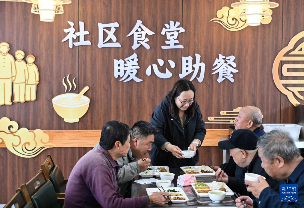 4月29日,在扬州市江都区邵伯镇甘棠社区幸福邻里食堂,社区工作人员(左三)给老年居民端汤。