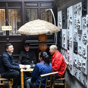 4月29日,在扬州市江都区邵伯镇甘棠社区老街工作室银发议事角,社区干部(左一)了解老年居民的生活状态。