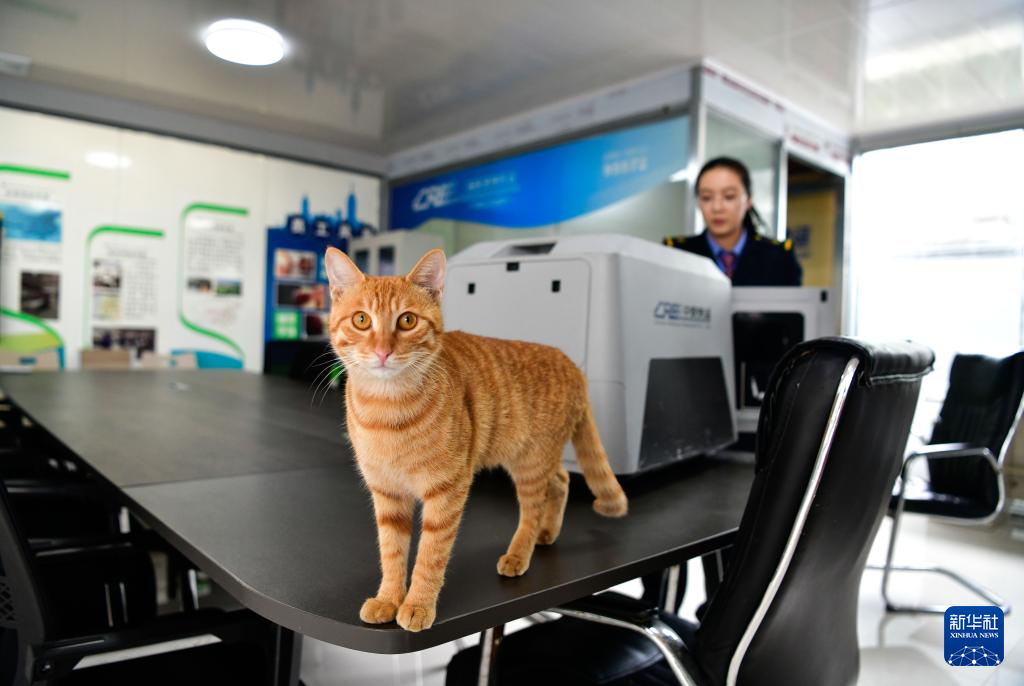 4月29日,中铁快运贵阳北站营业部工作人员与宠物猫互动。