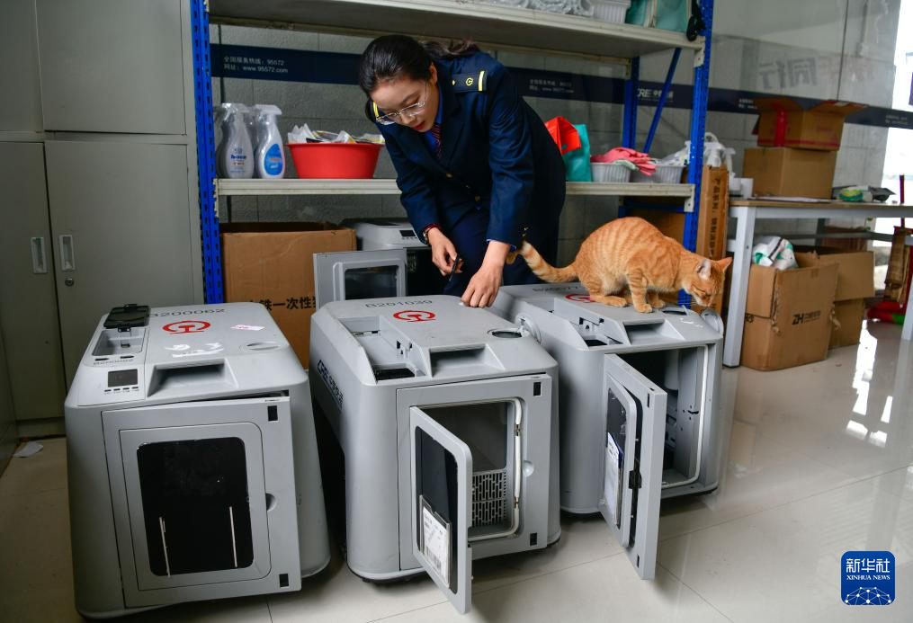 4月29日,中铁快运贵阳北站营业部工作人员整理“智能座舱”宠物运输箱。