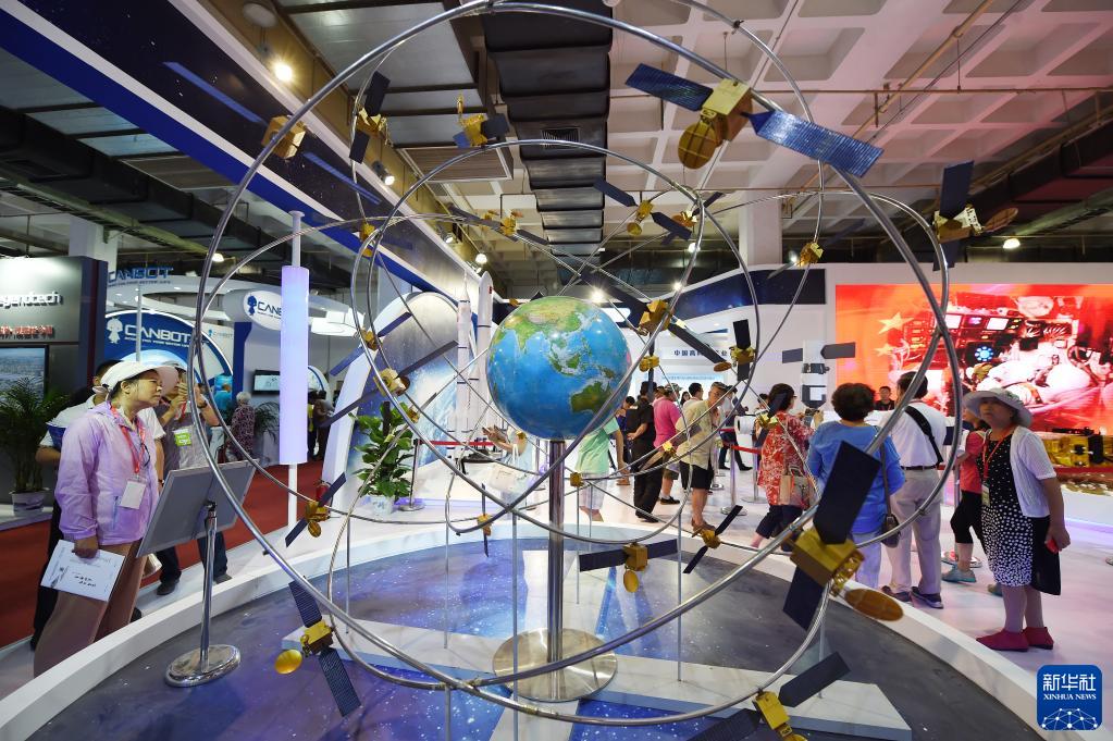 參觀者在第二十屆中國北京國際科技產業博覽會上參觀展出的北斗衛星導航系統模型(2017年6月9日攝)。新華社記者 鞠煥宗 攝