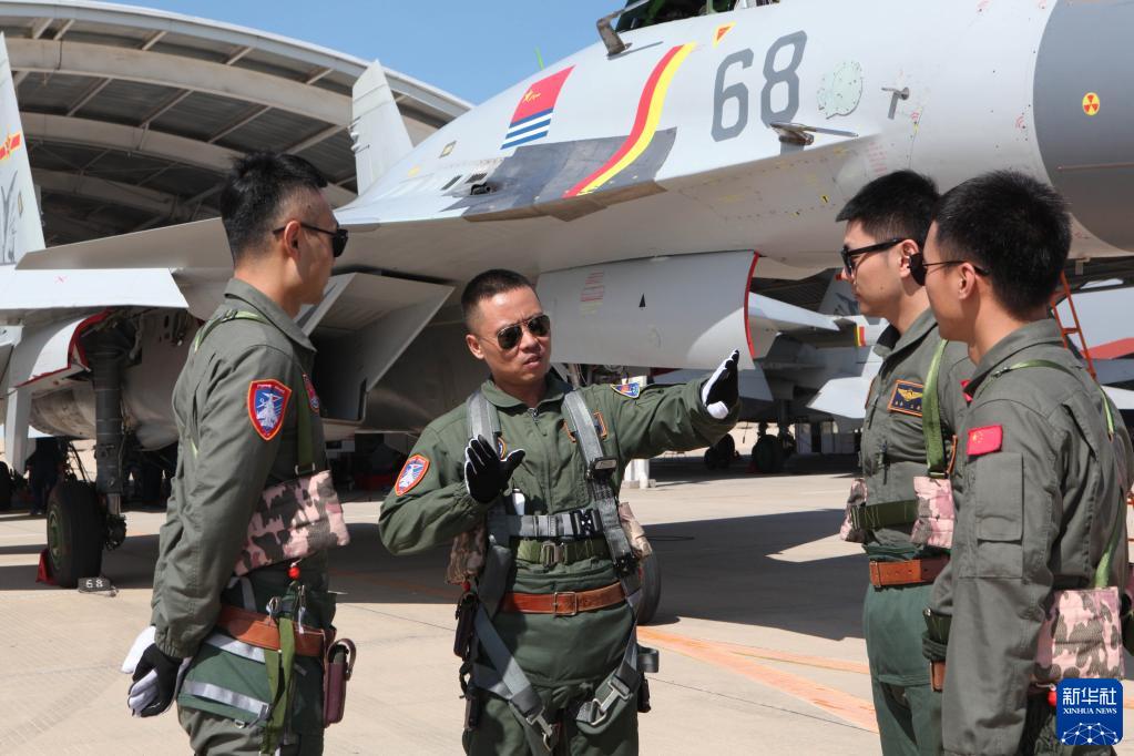 海軍航空大學某基地晝間飛行結束后,飛行教官王勇(左二)為學員們講評著艦動作(9月18日攝)。新華社發(周剛 攝)