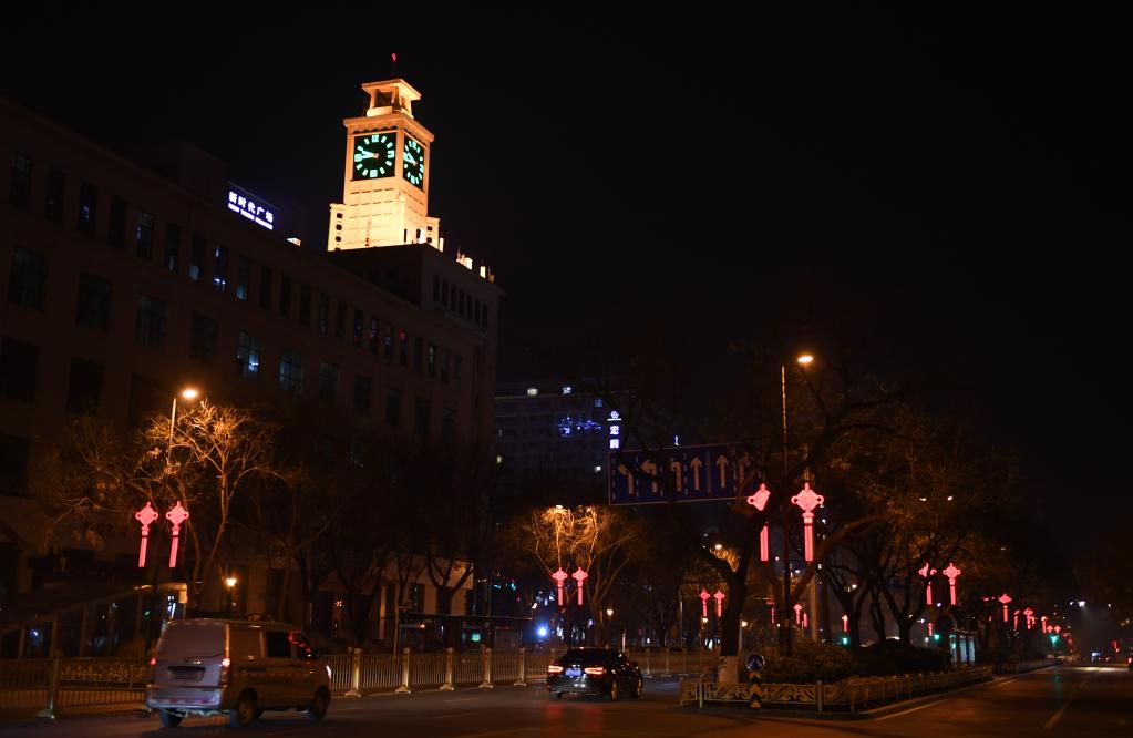 2021年12月31日,夜色下的西安報話大樓塔鐘。新華社記者 李一博 攝