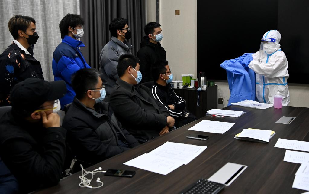 2021年12月24日,在西安外國語大學,醫務人員為即將前往隔離酒店送考上門的師生講解防護服穿脫的注意事項。新華社記者劉瀟 攝