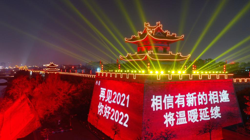 2021年12月31日拍攝的西安城墻燈光秀(無人機照片)。新華社記者 陶明 攝
