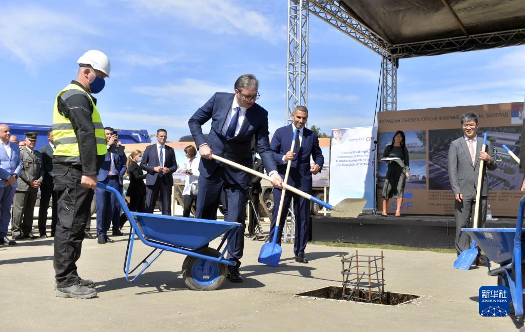 2021年9月9日,塞爾維亞總統武契奇(中)在貝爾格萊德為歐洲地區首家中國疫苗工廠奠基。新華社發(普雷德拉格·米洛薩夫列維奇攝)