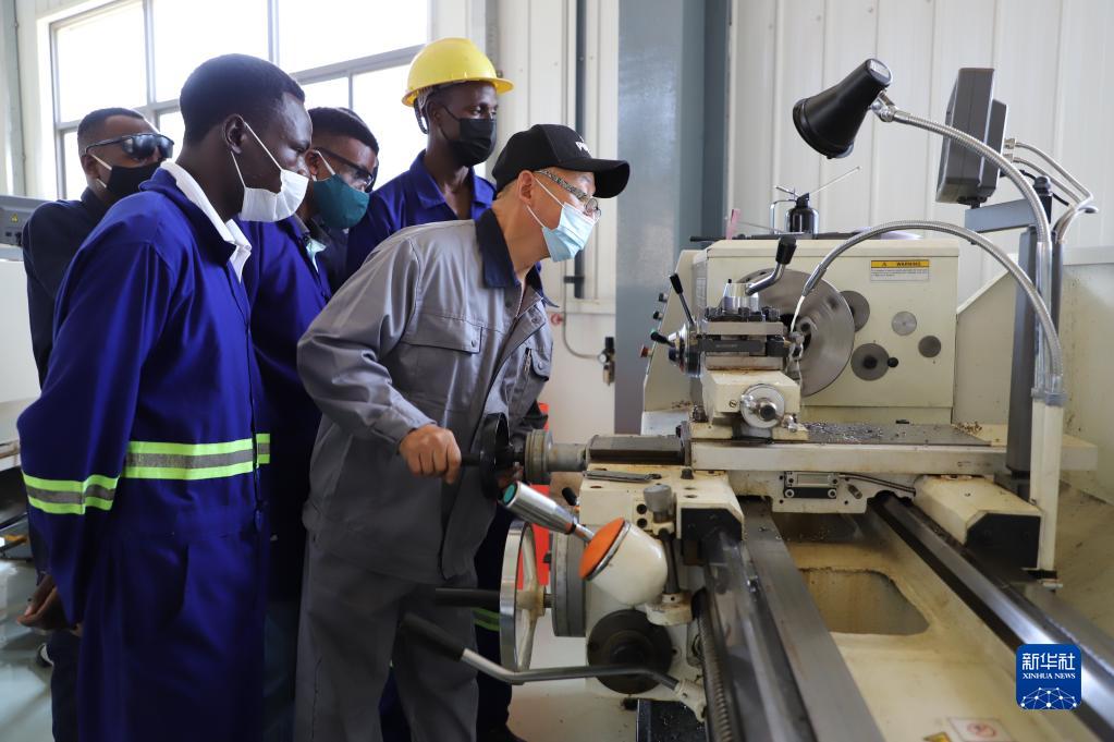2021年11月9日,在位于烏干達中部穆科諾地區納曼韋工業園的中國援烏工業技能培訓與生產中心,一名中方導師為學員演示如何操作機械。新華社記者 張改萍 攝