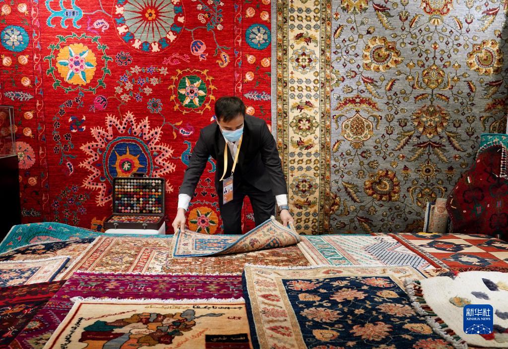 2021年11月8日,工作人員在進博會阿富汗手工羊毛地毯展臺整理商品。新華社記者 劉穎 攝
