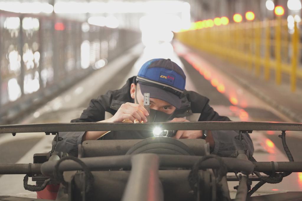 廣州動車段的動車機械師在檢修動車。(廣州動車段供圖)