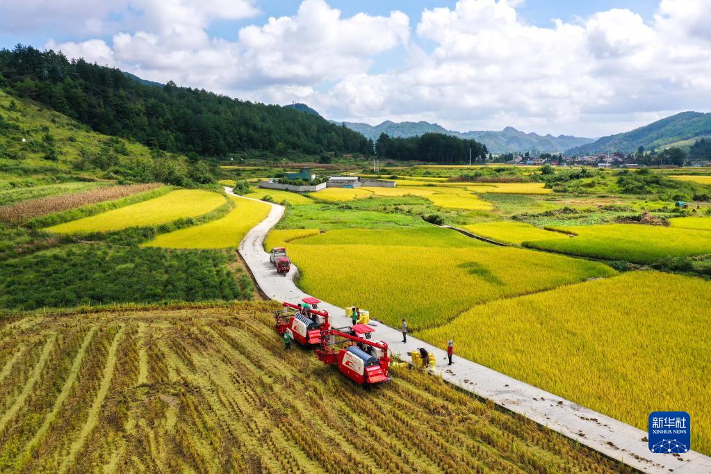 2021年9月15日,貴州省龍里縣灣灘河鎮羊場社區的農民在搶收稻谷(無人機照片)。新華社記者 楊文斌 攝