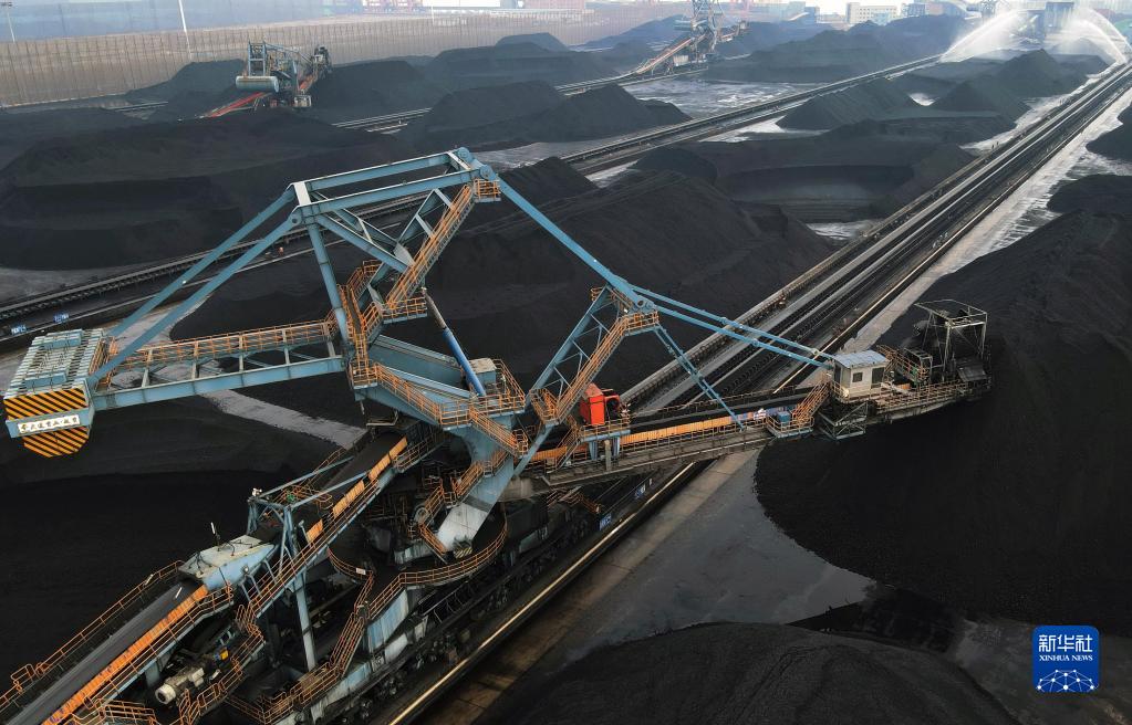 2021年12月8日,唐山港京唐港區煤炭堆場的堆料機在工作中(無人機照片)。新華社記者 楊世堯 攝