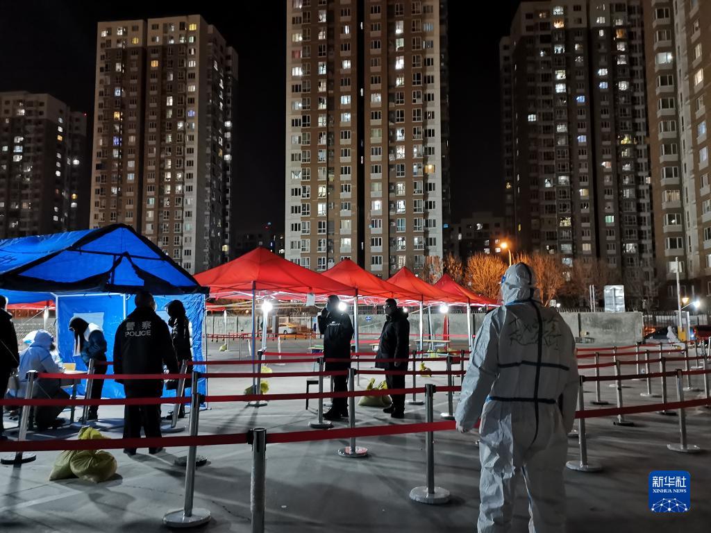 夜間,趙洪鑫(右)組織居民進(jìn)行核酸檢測(cè)(1月11日攝)。新華社發(fā)