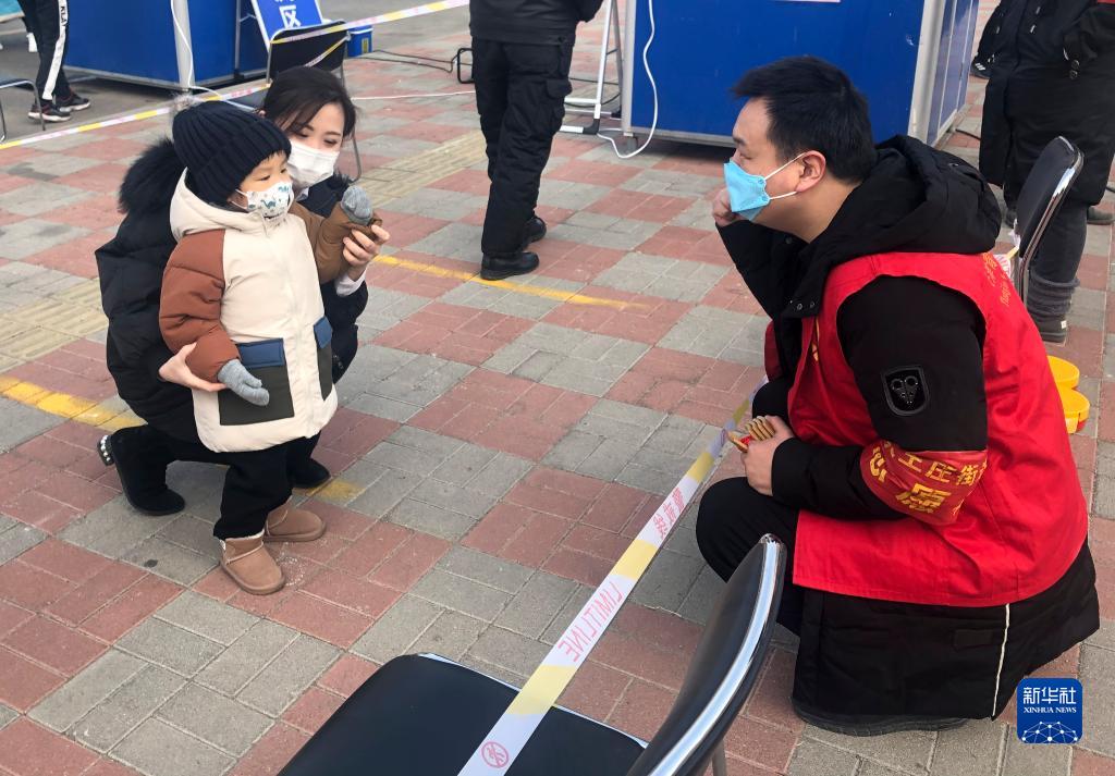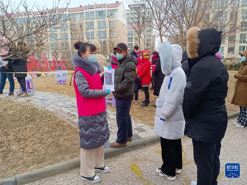 高春燕(左一)幫助前來(lái)核酸檢測(cè)的居民進(jìn)行掃碼登記(1月10日攝)。新華社發(fā)