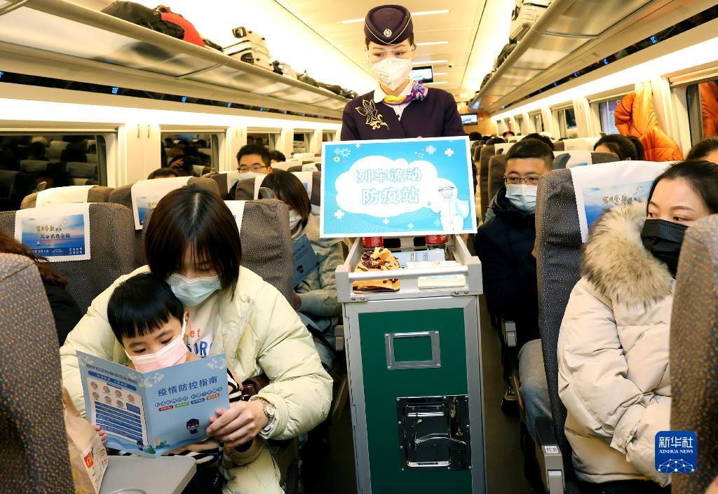 1月16日,乘務員在上海虹橋開往漢口的G1724次列車上向旅客分發防疫宣傳冊。新華社記者 陳飛 攝