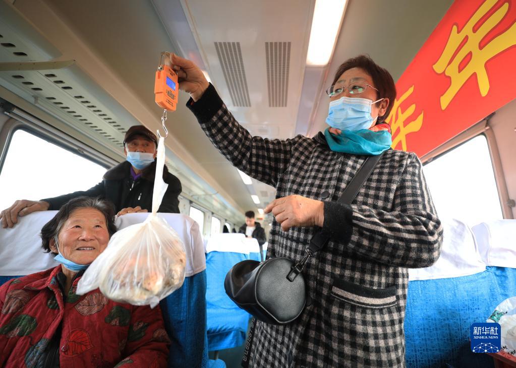 1月15日,在4318次列車上,一名農民給旅客購買的豬肉稱重。這是一輛行駛在東北東部山區的慢火車。為助力鄉村振興,中國鐵路沈陽局集團有限公司吉林客運段在列車上開辦“年貨大集”。沿線各村鎮的農民不用等到進城,就可在車廂里售賣自家山貨。新華社記者 楊青 攝