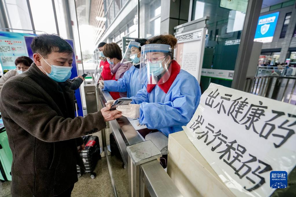 1月17日,在浙江省湖州市長興站進站口,防疫工作人員和轄區志愿者查驗進站旅客健康碼、行程碼。新華社發(吳拯攝)