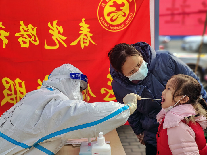 在安陽(yáng)市文峰區(qū)紫薇大道街道春光路社區(qū),醫(yī)護(hù)人員為一名小朋友進(jìn)行核酸檢測(cè)取樣(1月11日 麻翛然攝)