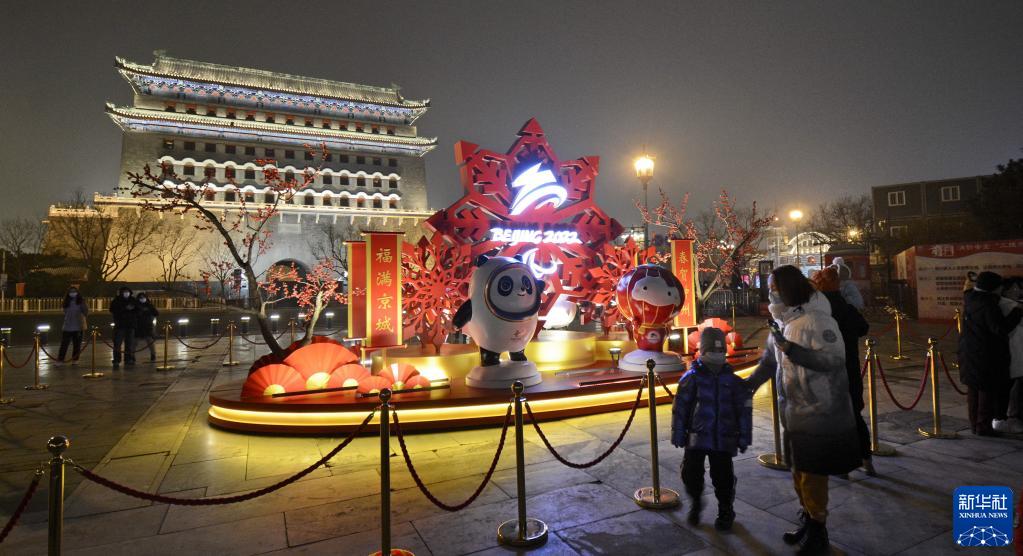 1月30日,市民在前門大街觀賞春節和冬奧主題景觀燈。新華社記者李欣攝