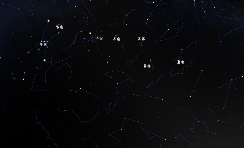 天津市天文學會理事、天文科普專家修立鵬介紹說,中國古代將星空劃分成“三垣四象”七片星區,又將東南西北四片星區細分為二十八星宿。根據星宿排列的不同形狀,以四種動物命名天空四方的星宿,即東方的青龍,西方的白虎,南方的朱雀,北方的玄武。其中,西方的白虎由奎、婁、胃、昴、畢、觜、參等七個星宿組成。奎為虎尾,婁、胃、昴、畢為虎身,觜為虎頭,參為虎爪。