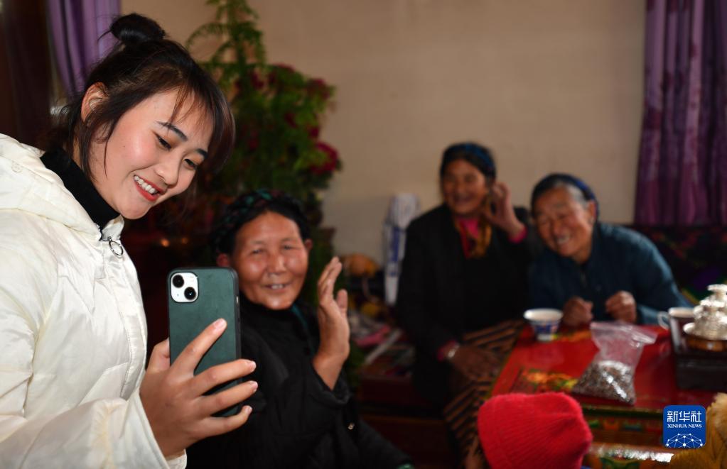 云南省楚雄彝族自治州的軍屬普曉虹寒假期間跟隨官兵到三位老阿媽家里走訪,她在和云南老家父母視頻通話時說:“爸媽,我在西藏有了三個阿媽!”(1月26日攝)。新華社記者 覺果 攝