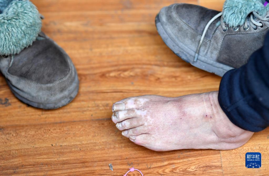 達吉阿媽的身上,如今仍留有送菜時的凍傷(1月26日攝)。新華社記者 覺果 攝