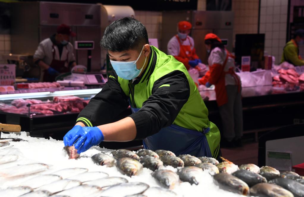 2021年12月31日,在北京市海淀區一家超市,工作人員碼放水產品。新華社記者任超 攝