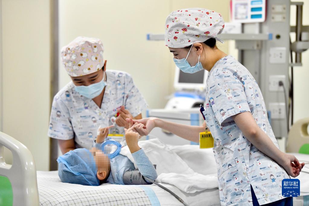 在山東省棗莊市婦幼保健院兒童ICU病房,醫護人員為完成靶向治療藥物諾西那生鈉的4歲脊髓性肌萎縮癥患兒加油鼓勁(1月1日攝)。諾西那生鈉注射液是我國首個獲批治療脊髓性肌萎縮癥的進口藥物,2019年進入中國市場時,每針價格近70萬元。在2021年國家醫保目錄藥品談判中,以3.3萬元每針的價格進入新版醫保藥品目錄。新華社記者 郭緒雷 攝