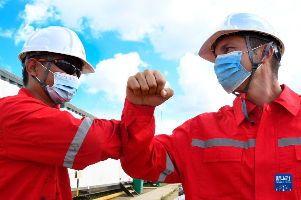 2020年11月27日,中國石油集團長城鉆探工程公司古巴項目GW91鉆井平臺中方員工(左)同古方員工互相致意。新華社發(華金·埃爾南德斯攝)