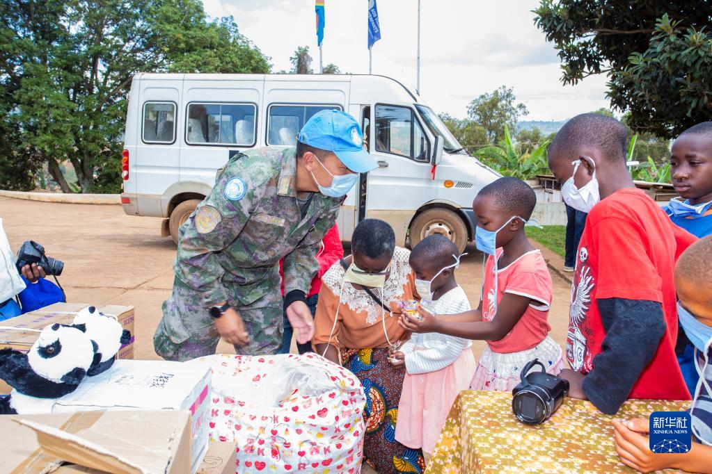 2021年6月1日,在剛果(金)東部城市布卡武的SOS兒童村,中國第24批赴剛果(金)維和醫療分隊的隊員把糖果分給孩子們。新華社發