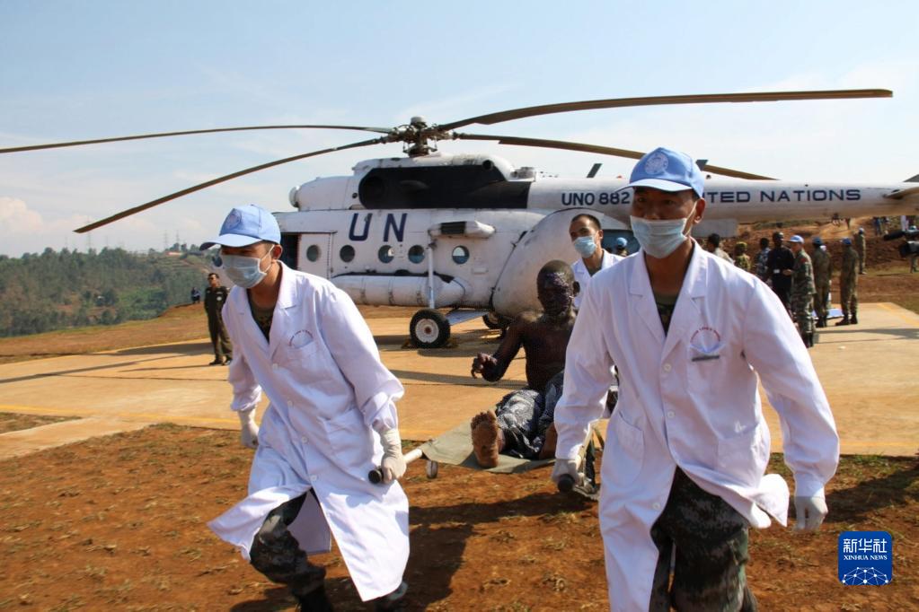 2010年7月3日,中國赴剛果(金)維和醫療分隊醫護人員在剛果(金)南基伍省布卡武機場運送油罐車爆炸中的受傷者。新華社發(郭云飛攝)