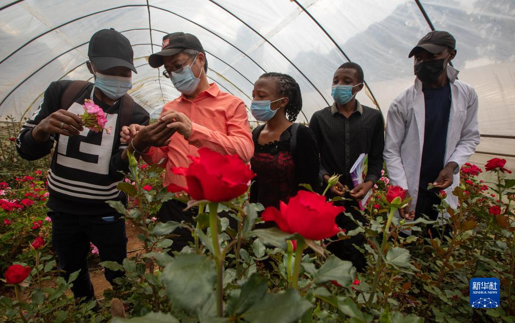 2021年6月25日,在肯尼亞納庫魯郡的埃格頓大學,來自中國的農學教授劉高瓊(左二)和學生們在溫室大棚內討論花卉育種和病蟲害防治。新華社記者 張宇 攝