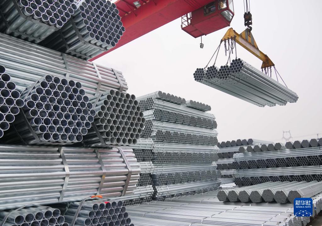 河北省遷安市一家鍍鋅管生產企業的工人操作機械設備吊運鋼管(2021年12月11日攝)。新華社記者 楊世堯 攝