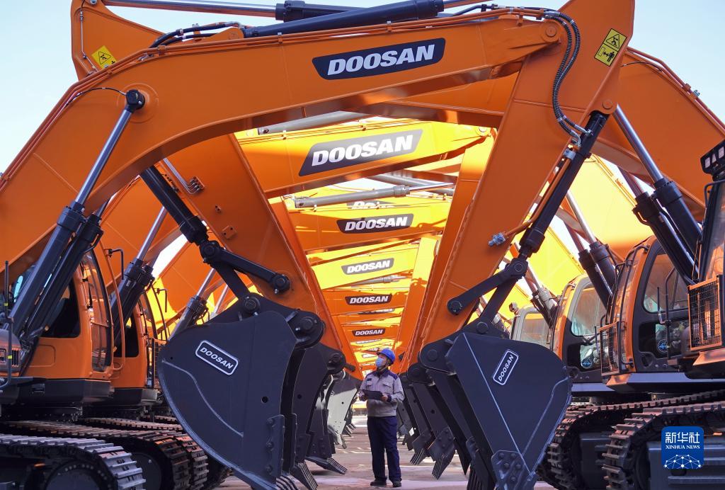 工作人員在山東煙臺開發區一家工程機械有限公司檢查出廠機械設備(1月17日攝)。新華社發(唐克 攝)
