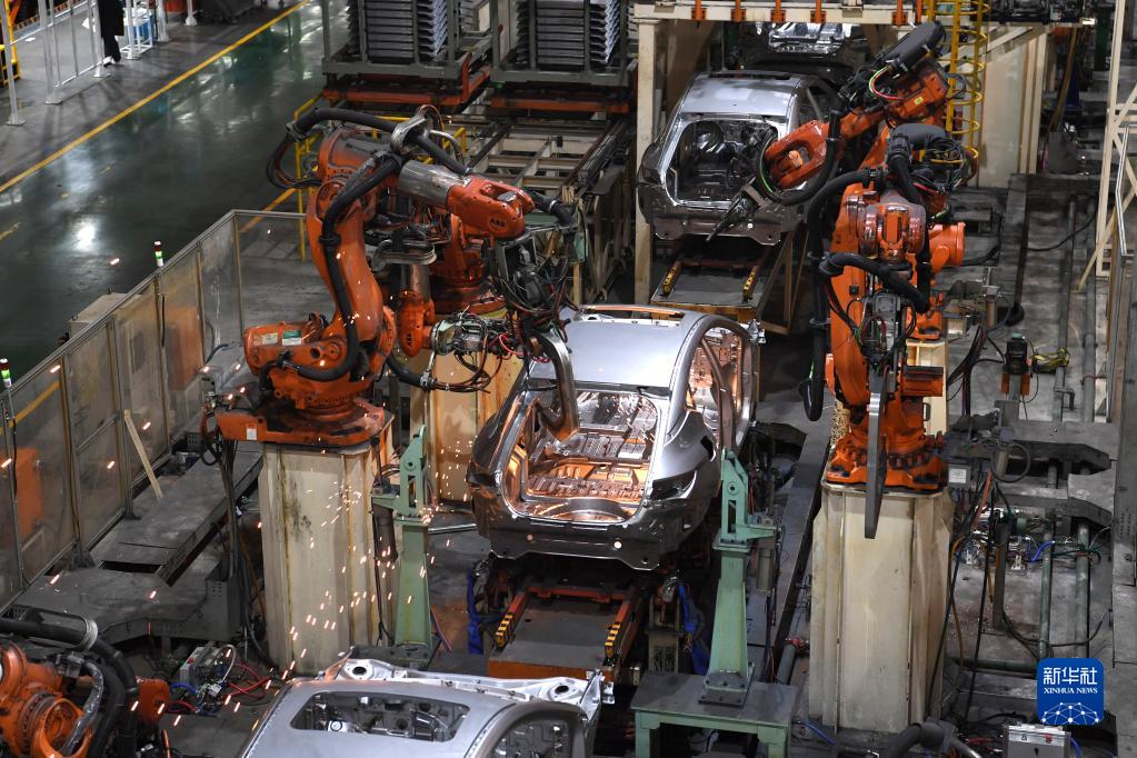 工業機器人在江淮汽車乘用車焊接車間生產線上工作(2月22日攝)。新華社記者 劉軍喜 攝