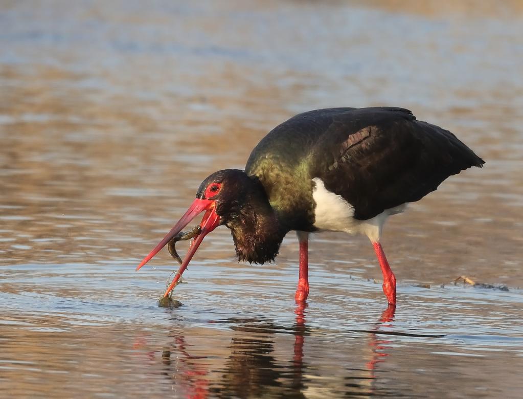 ↑圖為一只黑鸛在北京房山溪流中棲息覓食(北京市園林綠化局供圖)
