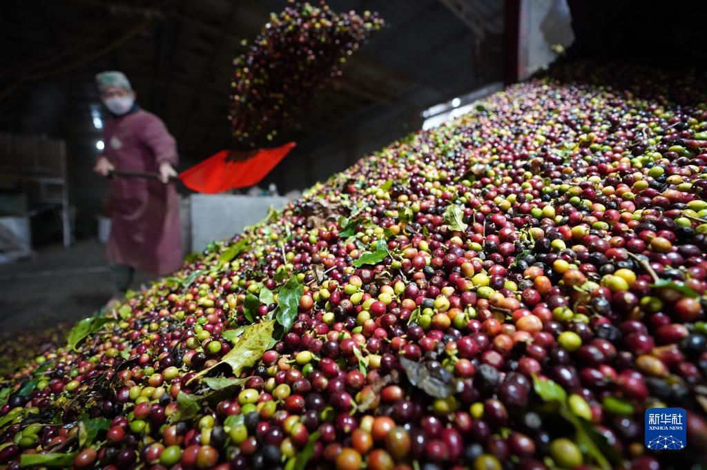 這是2月22日在云南普洱市一家咖啡生產企業內拍攝的新收購并準備進行處理的咖啡鮮果。新華社記者 陳欣波 攝