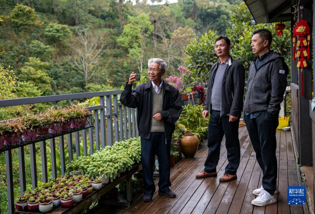 80歲的高級農藝師廖秀桂(左一)在云南普洱市思茅區小凹子咖啡莊園內向兩名游客做介紹(2月22日攝)。新華社記者 陳欣波 攝