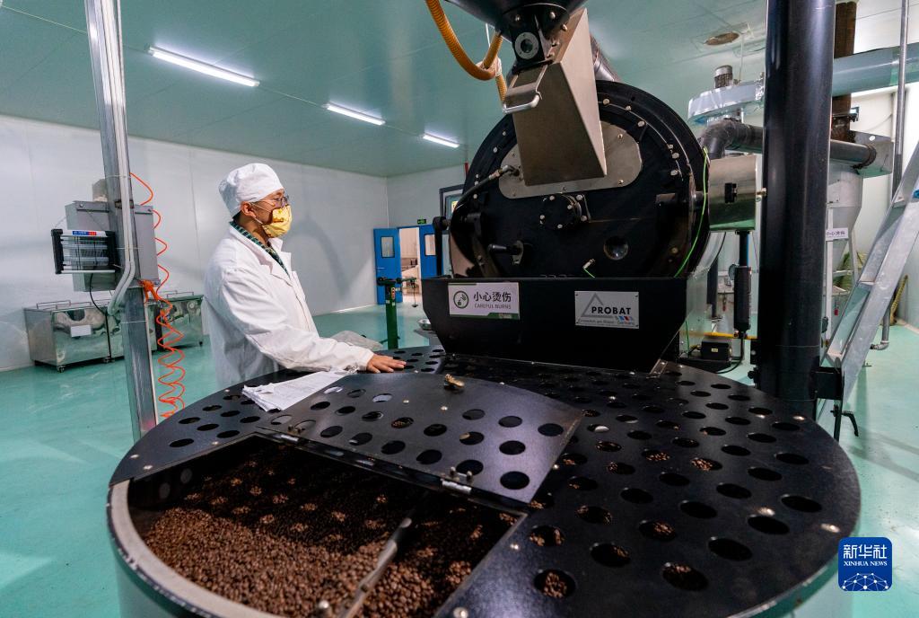 在云南普洱愛伲莊園咖啡有限公司內,工作人員在烘焙豆生產線上忙碌(2月22日攝)。新華社記者 陳欣波 攝