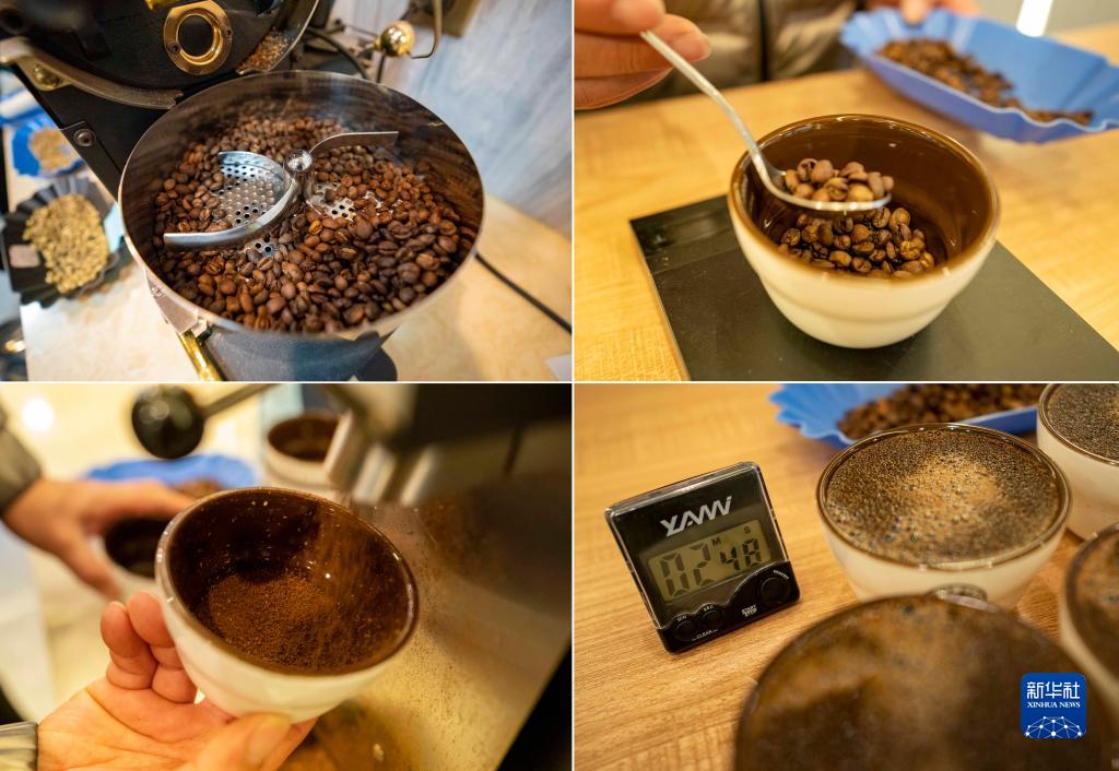 在云南普洱奧萊咖啡有限公司內,工作人員在加工收購的本地咖啡準備進行杯測:左上圖為咖啡烘焙機在晾涼咖啡豆;右上圖為稱重咖啡豆;左下圖為磨咖啡豆;右下圖為沖好的等待杯測的咖啡(2月22日攝)。新華社記者 陳欣波 攝