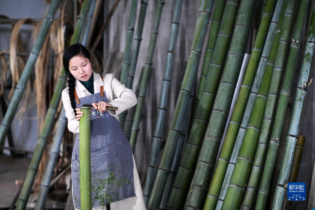 在貴州赤水市大同鎮(zhèn)民族村,楊昌芹在非遺“赤水竹編”培訓(xùn)基地加工竹子(2019年11月11日攝)。新華社記者 楊文斌 攝