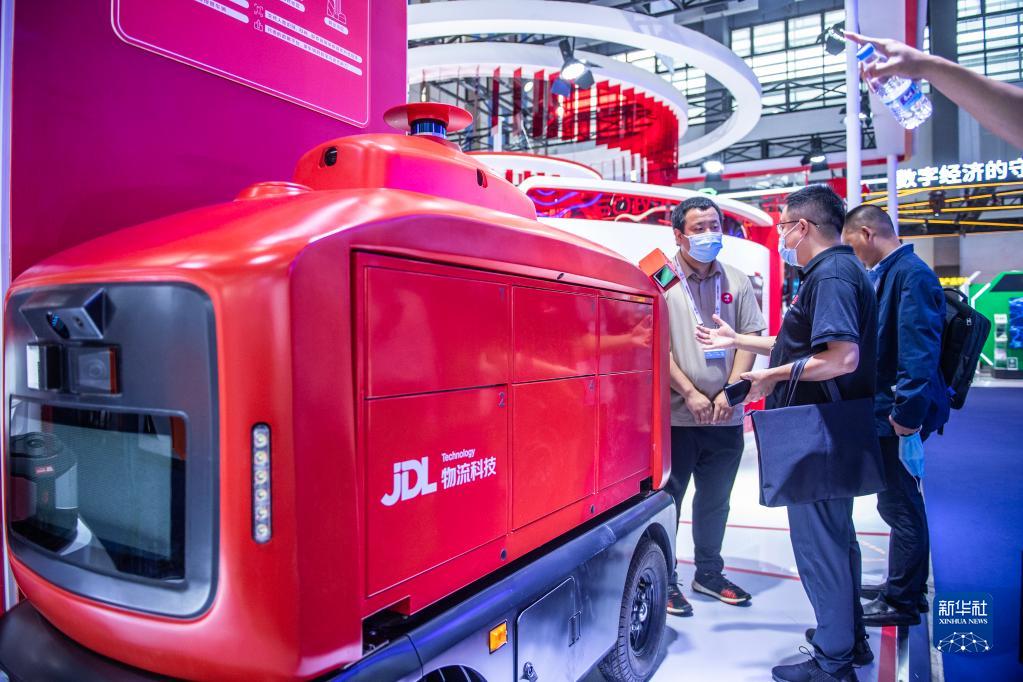 參會者在2021中國國際大數(shù)據(jù)產(chǎn)業(yè)博覽會上了解無人駕駛快遞運輸車(2021年5月26日攝)。新華社記者 陶亮 攝